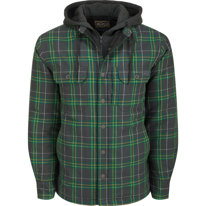 The Drake Men’s Campfire Flannel Jac Shirt Hoodie is built to keep you warm and comfortable on an Autumn afternoon. The Jac is made from a cotton and recycled polyester blend and features an adjustable drawstring hood, a button snap closure, interior quilted insulation, and adjustable cuffs. The Jac gets its inspiration from work wear and can be worn as a shirt or as a mid-layer when extra warmth is needed. At the game or the job site, the Drake Campfire Flannel Jac Shirt Hoodie will keep you comfortably warm with style.