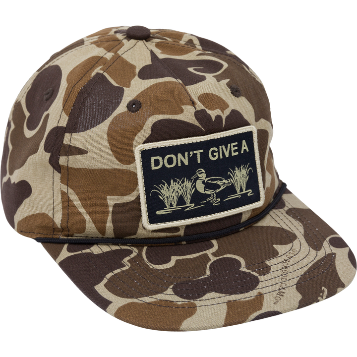 Engineered from high-quality cotton twill, this Don't Give A Duck Rope Cap combines durability with style. The 5-panel unstructured crown construction provides a comfortable, broken-in feel from day one. Features include a distinctive flat visor with rope trim and a practical adjustable snap back closure for customized fit. Perfect for field or casual wear with technical performance that serious waterfowlers demand.