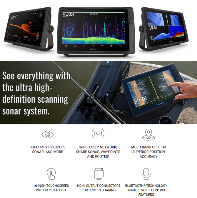 Built-In Sonar Support: Compatible with Garmin’s UHD and LiveScope™ sonar systems for crystal-clear imaging and real-time underwater views (transducer sold separately).