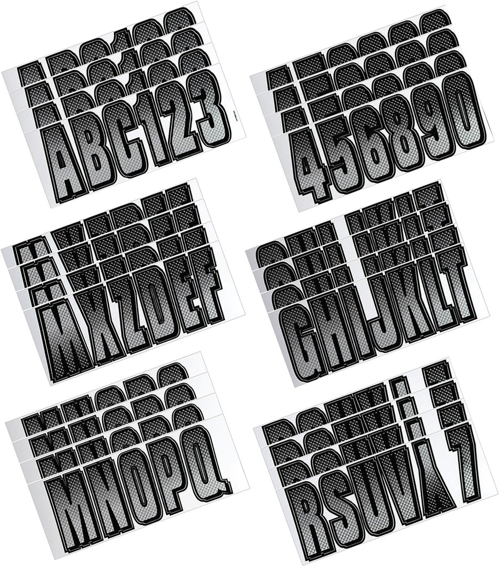 3 Inch Size Factory-Matched color kit includes 4 each of the letters A-Z and the numbers 0-9, for a total of 146 decals. Available in DIY package or mounted and spaced on application tape ready to install. (scroll to bottom)